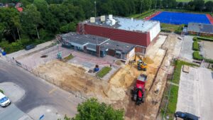 Onze collega Tim maakte deze dronefoto op de bouwplaats bij De Zwet in Zuidlaren. Hier werken wij voor gemeente Gemeente Tynaarlo niet aan één, maar aan twee sporthallen! De bestaande sporthal wordt gerenoveerd en daarnaast verzorgen wij de nieuwbouw van een tweede sportruimte.