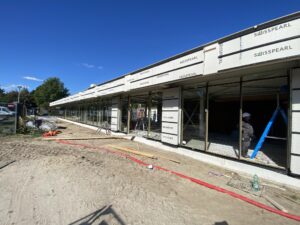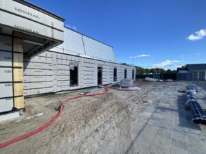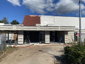 De eerste HSB-elementen zijn geplaatst en het gebouw krijgt daarmee steeds meer zijn definitieve vorm. Ook de kozijnen voor de nieuwe toestellenberging zijn inmiddels gemonteerd. Stap voor stap komt het geheel tot leven!