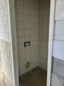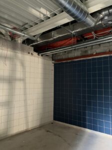 De technische installaties zijn worden volop geplaatst en verdwijnen langzaam uit het zicht. Ondertussen krijgt de afwerking vorm: het tegelwerk van de kleedkamers in de eerste bouwfase is volop in gang, de ruimtes beginnen steeds meer hun definitieve uitstraling te krijgen.