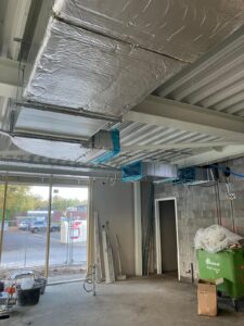 Buiten tekent het nieuwe karakter van het gebouw zich al af. De groene gevelplaten zijn gemonteerd en geven een eerste indruk van het frisse en eigentijdse gevelbeeld dat het aanzicht zal bepalen. Stap voor stap komt het eindresultaat dichterbij — een gebouw dat klaar is voor de toekomst.