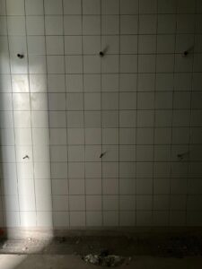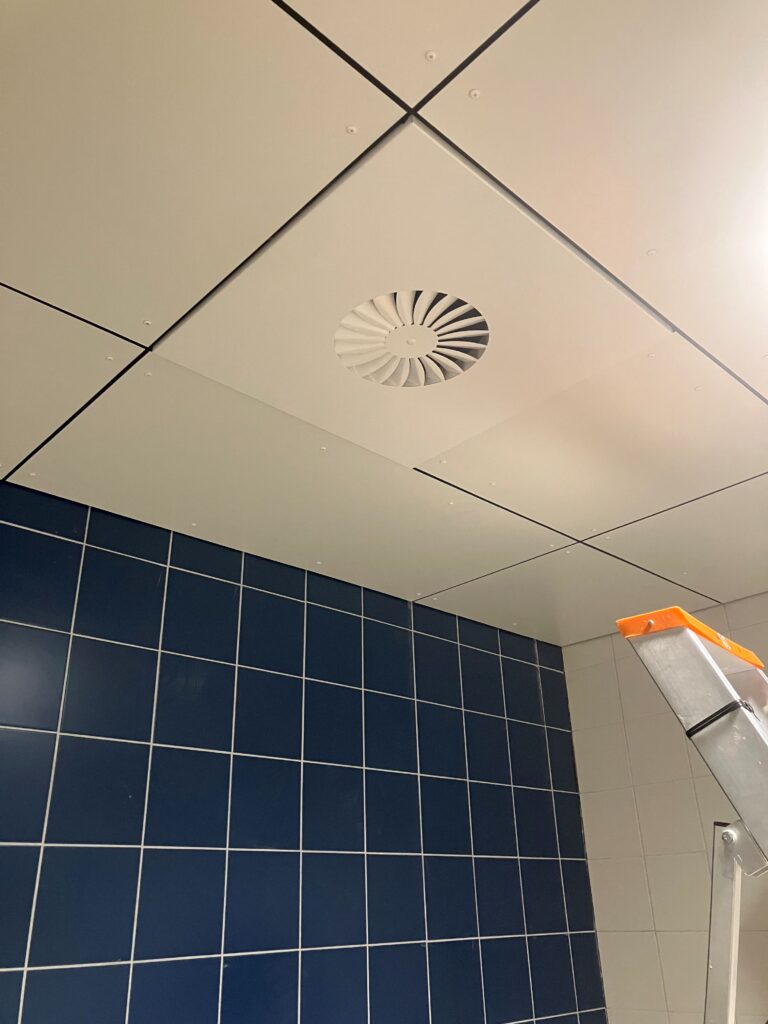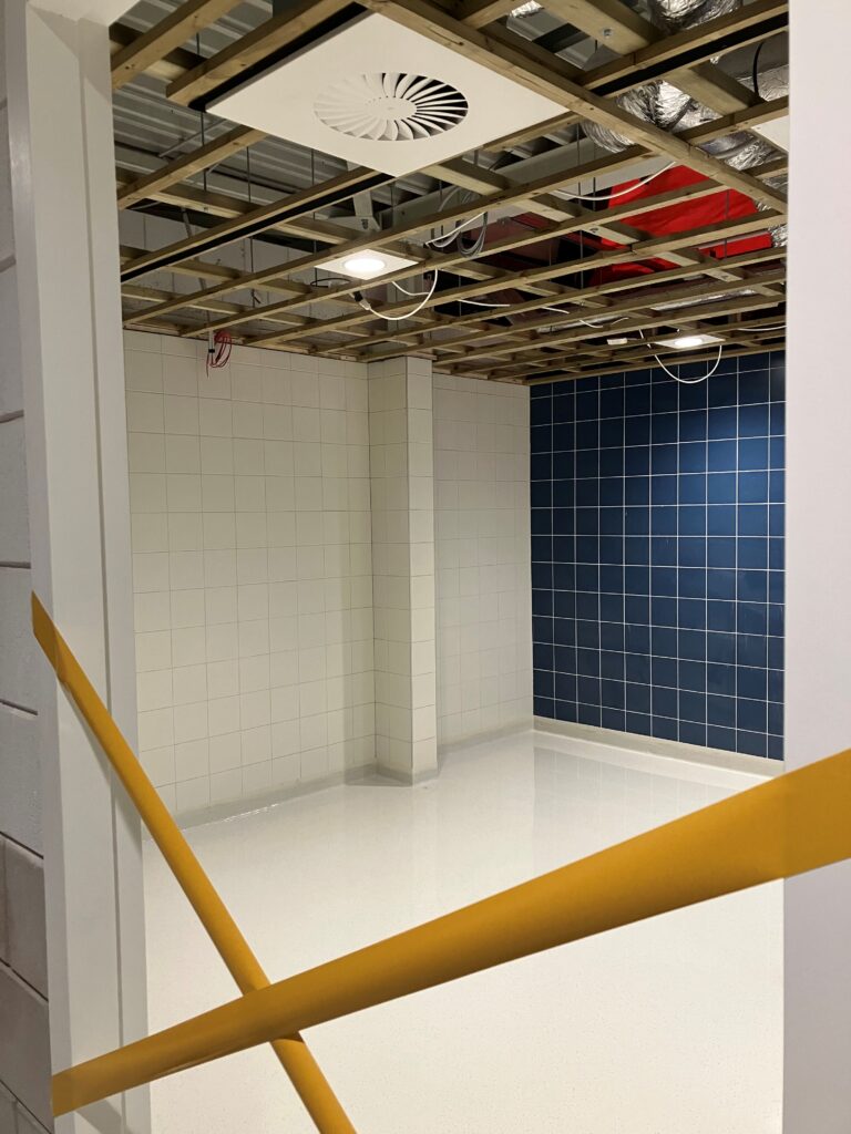 De technische installaties zijn worden volop geplaatst en verdwijnen langzaam uit het zicht. Ondertussen krijgt de afwerking vorm: het tegelwerk van de kleedkamers in de eerste bouwfase is volop in gang, de ruimtes beginnen steeds meer hun definitieve uitstraling te krijgen.