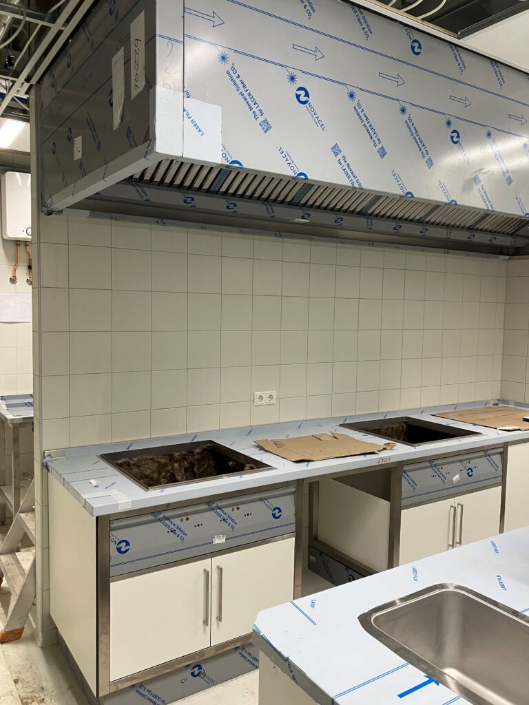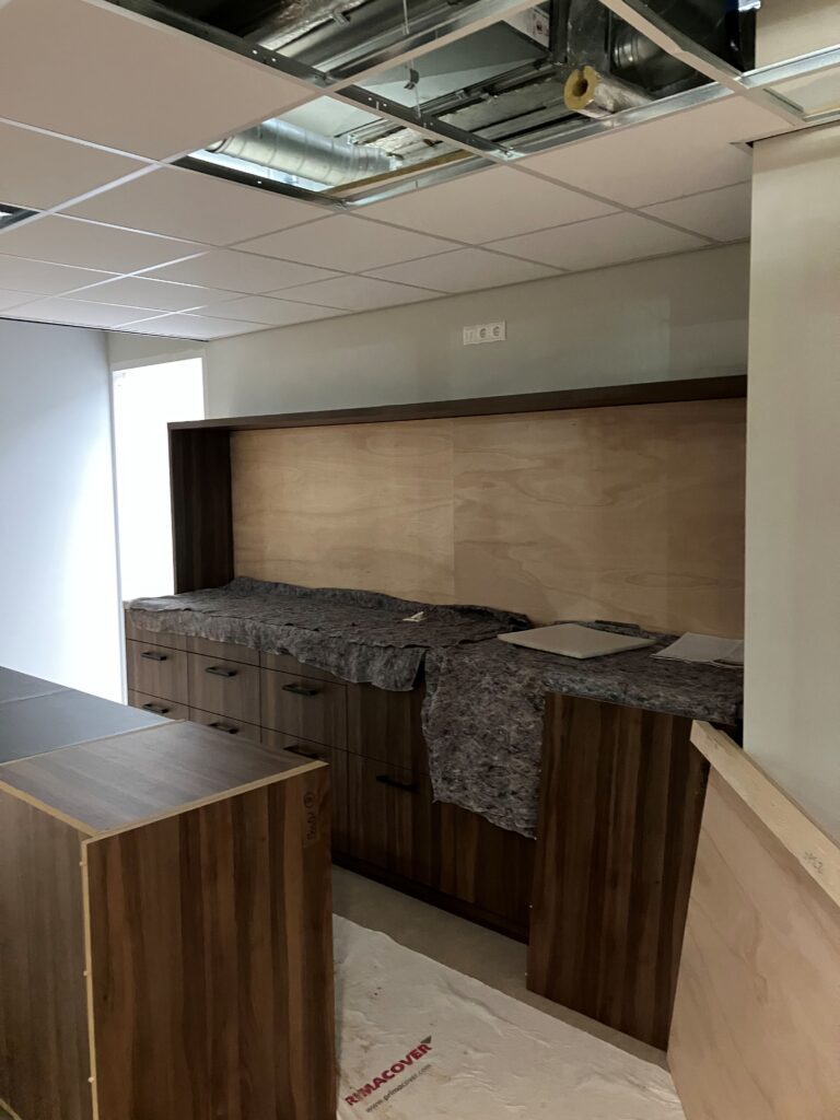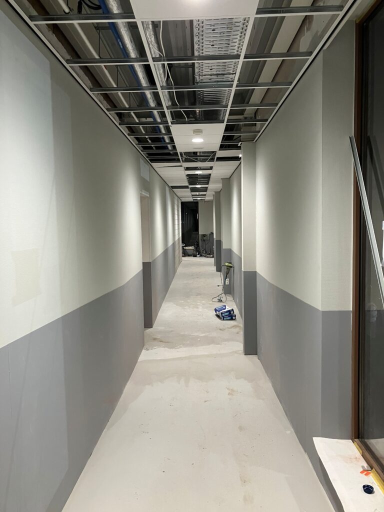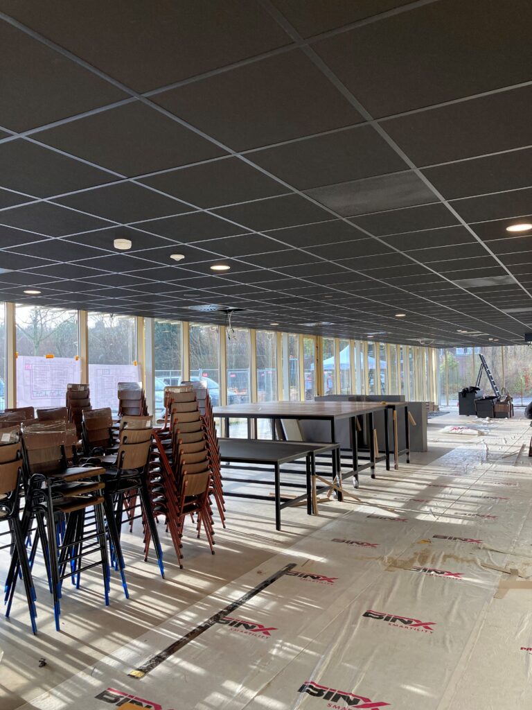 De laatste puntjes worden op de i gezet, zodat alles tot in detail klopt. De kantine krijgt een chique uitstraling met een stijlvol zwart plafond, ook de keuken van kantine is bijna klaar. Hoewel de buitenkant er nu nog niet helemaal af uitziet, zal deze bij de oplevering volledig gereed zijn. Het wordt een plek waar functionaliteit en verschillende verenigingen samenkomen!