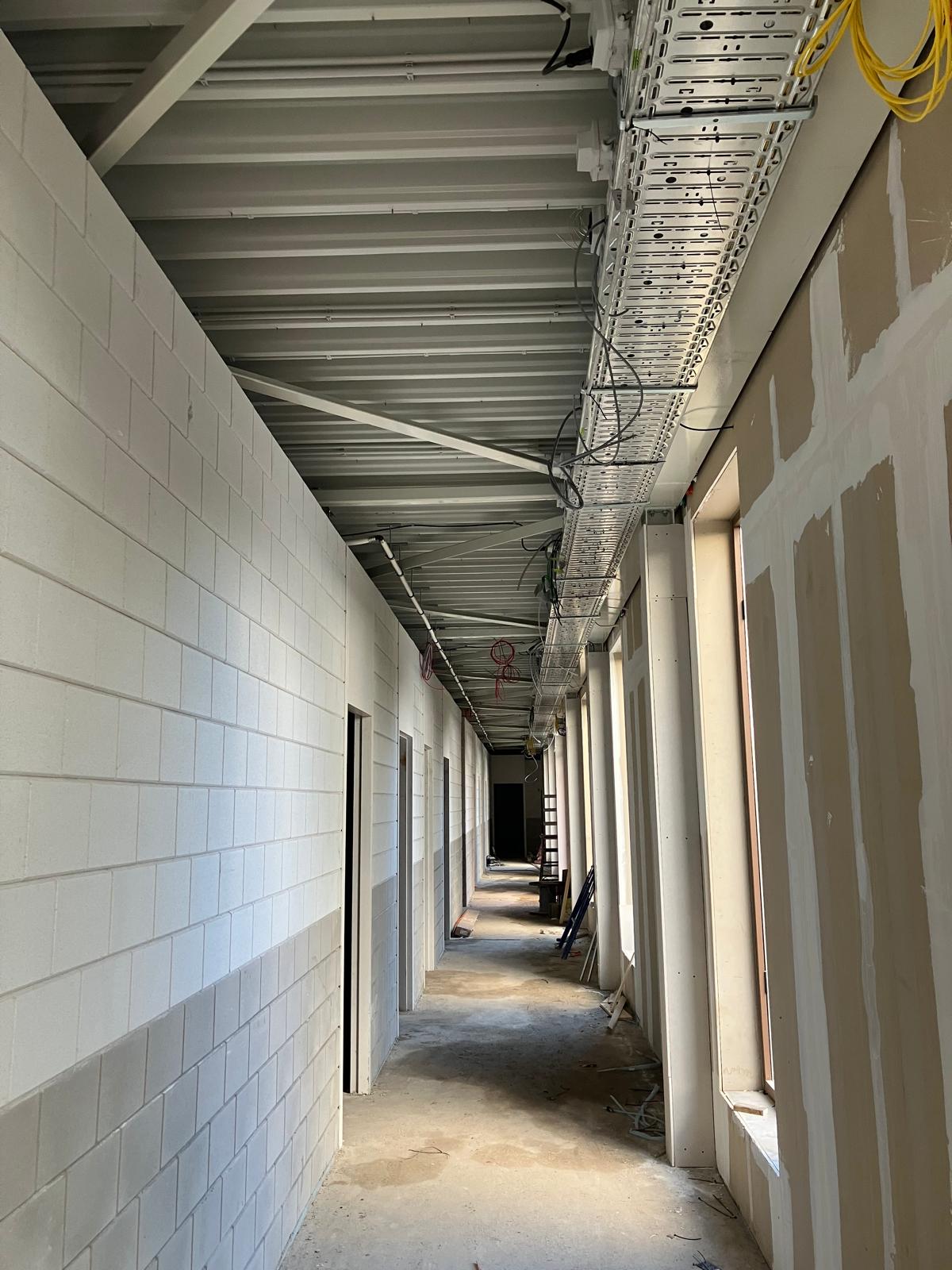 Buiten tekent het nieuwe karakter van het gebouw zich al af. De groene gevelplaten zijn gemonteerd en geven een eerste indruk van het frisse en eigentijdse gevelbeeld dat het aanzicht zal bepalen. Stap voor stap komt het eindresultaat dichterbij — een gebouw dat klaar is voor de toekomst.